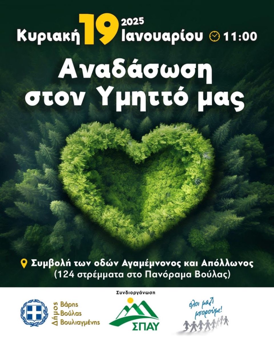 Μεγάλη δεντροφύτευση με περισσότερα από 1.000 αναπτυγμένα, πλατύφυλλα, βραδύκαυστα δενδρύλλια διοργανώνει ο Δήμος Βάρης Βούλας Βουλιαγμένης σε συνεργασία με το ΣΠΑΥ και το «Όλοι Μαζί Μπορούμε» την Κυριακή 19 Ιανουαρίου στις 11:00.