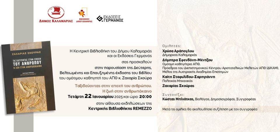 Με αφορμή την κυκλοφορία της δεύτερης, βελτιωμένης και επαυξημένης έκδοσης του βιβλίου του Ζαχαρία Σκούρα με τίτλο «Ταξιδεύοντας στην εποχή του ανθρώπου. Η ζωή στην ανθρωπόκαινο», διοργανώνεται την Τετάρτη 22 Ιανουαρίου μια ξεχωριστή εκδήλωση με ομιλητές τη Δήμαρχο Καλαμαριάς, Χρύσα Αράπογλου, την ομότιμη καθηγήτρια του ΑΠΘ, Δήμητρα Σφενδόνη-Μέτζου, την πολιτικό μηχανικό Καίτη Σταφυλίδου-Σαρηγιάννη και φυσικά τον συγγραφέα.