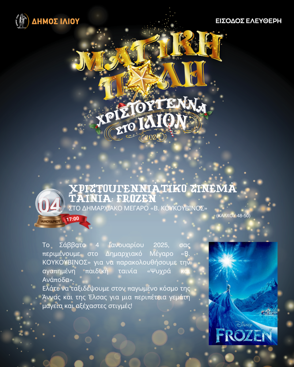 Το Σάββατο 4 Ιανουαρίου 2025, σας περιμένουμε στο Δημαρχιακό Μέγαρο «Β. ΚΟΥΚΟΥΒΙΝΟΣ» για να παρακολουθήσουμε την αγαπημένη παιδική ταινία «Ψυχρά και Ανάποδα».