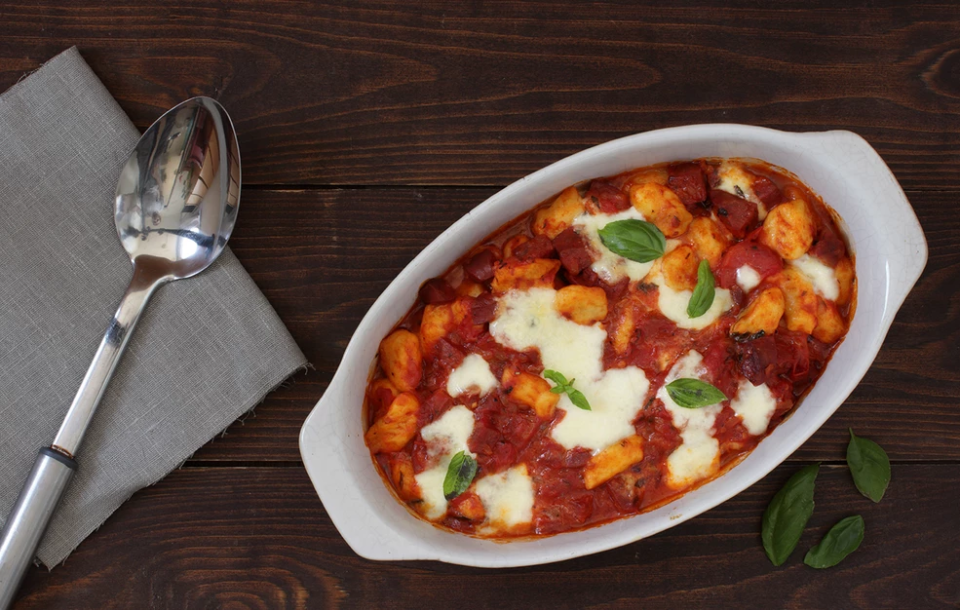 - Ανακατέψτε τα 3/4 της μοτσαρέλας και το μεγαλύτερο μέρος του βασιλικού μέσα στα νιόκι. Βάλτε το μείγμα σε άν πυρέξ και τοποθετήστε από πάνω την υπόλοιπη μοτσαρέλα.