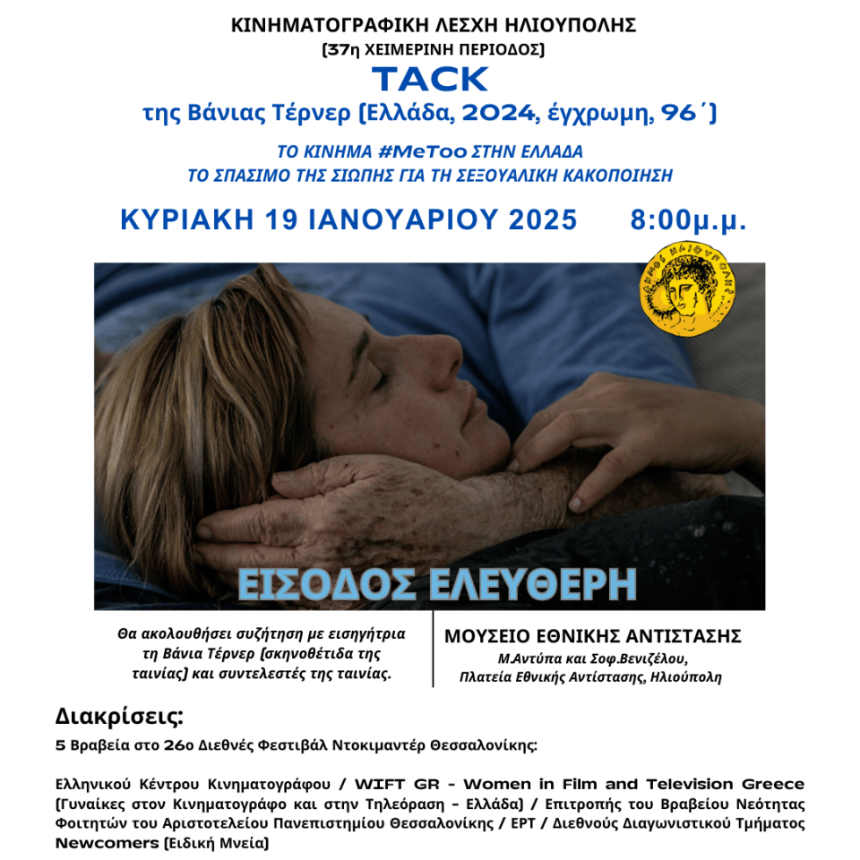 Η Κινηματογραφική Λέσχη Ηλιούπολης σας προσκαλεί στην προβολή της ταινίας «TACK» της Βάνιας Τέρνερ (ΕΛΛΑΔΑ, 2024, έγχρωμη, 96΄) στις 19 Ιανουαρίου 2025 και ώρα 8:00 μ.μ., στο Μουσείο Εθνικής Αντίστασης (Μαρίνου Αντύπα και Σοφοκλή Βενιζέλου, Πλατεία Εθνικής Αντίστασης, Ηλιούπολη).