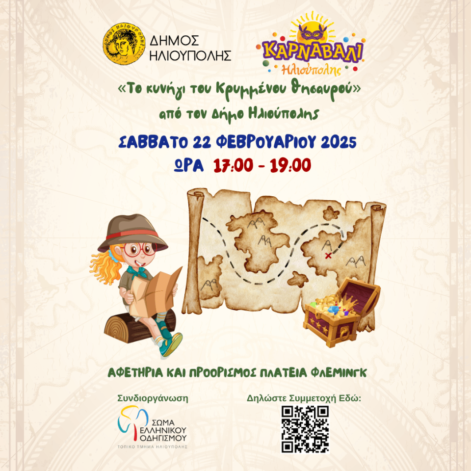Το Σάββατο 22 Φεβρουαρίου, 17:00 – 19:00, ο Δήμος Ηλιούπολης και το Σώμα Ελληνικού Οδηγισμού Τ.Τ. Ηλιούπολης διοργανώνουν «Κυνήγι Κρυμμένου Θησαυρού» με αφετηρία και τελικό προορισμό την Πλατεία Φλέμινγκ.