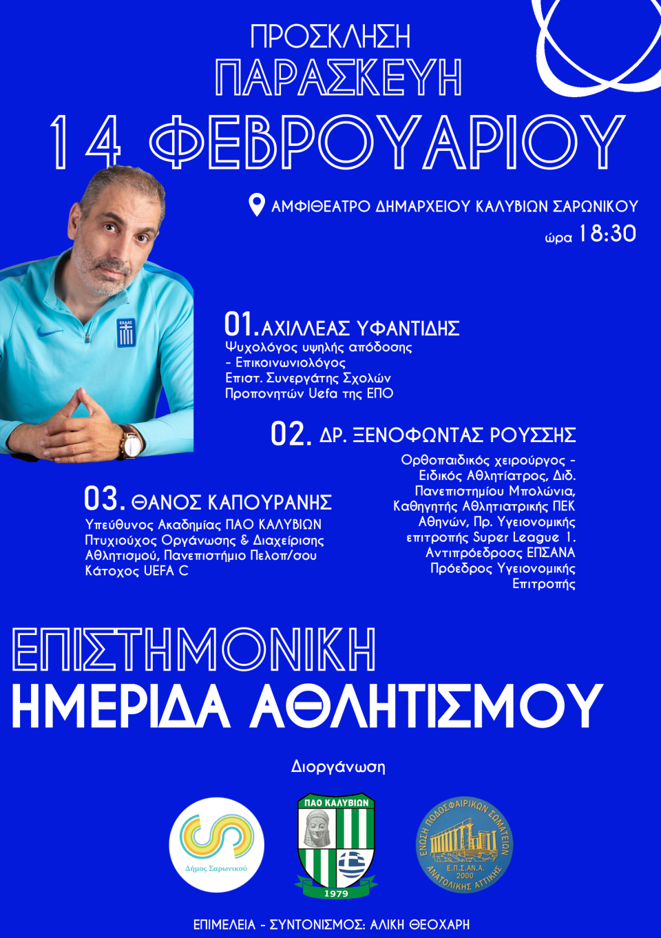 Στην ημερίδα θα μιλήσει ο Αχιλλέας Υφαντίδης ψυχολόγος υψηλής απόδοσης-επικοινωνιολόγος, ο Δρ. Ξενοφών Ρούσσης ορθοπεδικός χειρουργός-ειδικός αθλητίατρος και ο Θάνος Καπουράνης υπεύθυνος Ακαδημίας ΠΑΟ Καλυβίων ενώ θα συντονίζει η Αλίκη Θεοχάρη.