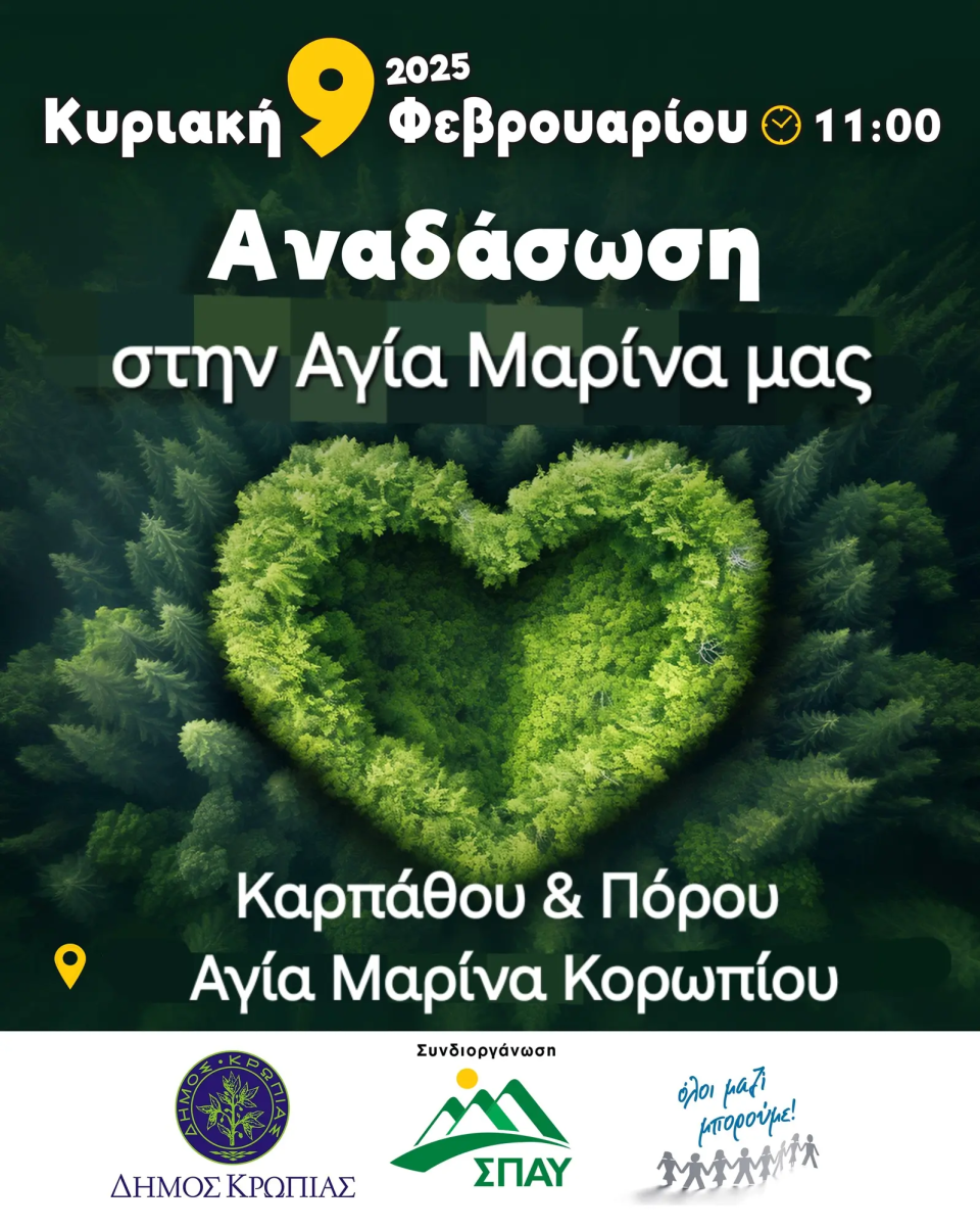 Σας προσκαλούμε στη εθελοντική δράση αναδάσωσης στις 11 το πρωί στη συμβολή των οδών Καρπάθου και Πόρου(προς Μικρό Μετόχι Αγίας Μαρίνας Κορωπίου με πρόσβαση από τη Λεωφ. Αγίας Μαρίνας προς οδούς, Δήλου, Σύμης, Καρπάθου)».