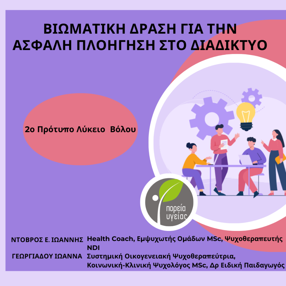Μετά από πρόσκληση του 2ου Πρότυπου Λυκείου Βόλου, στο πλαίσιο της εφαρμογής προληπτικών πρακτικών κατά το έργο της Συμβούλου Σχολικής Ζωής του σχολείου, κας Μαθινού Μαρίας ΠΕ02, το Κέντρο Θεραπειών και Εκπαίδευσης ΠΟΡΕΙΑ ΥΓΕΙΑΣ πρόκειται να υλοποιήσει βιωματικά εργαστήρια ανάπτυξης δεξιοτήτων και ασφαλούς πλοήγησης στο διαδίκτυο για τους μαθητές και τις μαθήτριες της Α’ τάξης.
