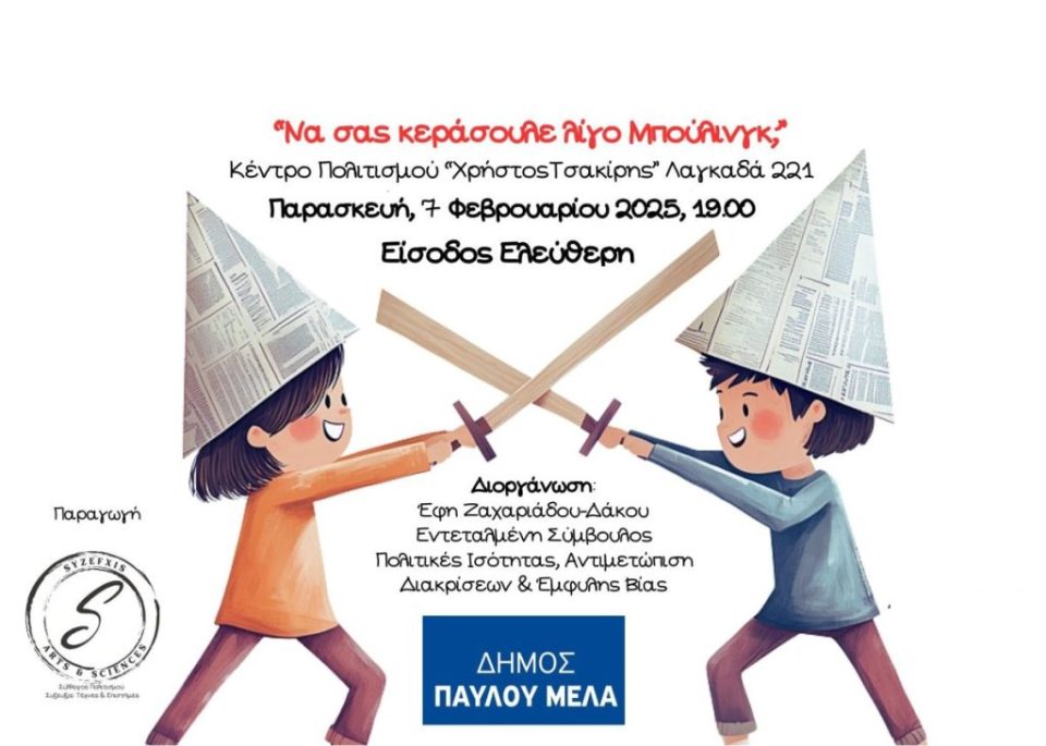Η κωμική παιδική θεατρική παράσταση «Να σας κεράσουμε λίγο Μπούλινγκ» σε σκηνοθεσία της Μαρίας Ιωαννίδου και κείμενο – μουσική της Έφης Βετουλάκη ανεβαίνει στη Σκηνή του Δημοτικού Θεάτρου του Κέντρου Πολιτισμού Χρήστος Τσακίρης του Δήμου Παύλου Μελά, Λαγκαδά 221 στη Σταυρούπολη, την Παρασκευή 7 Φεβρουαρίου και ώρα 19:00.