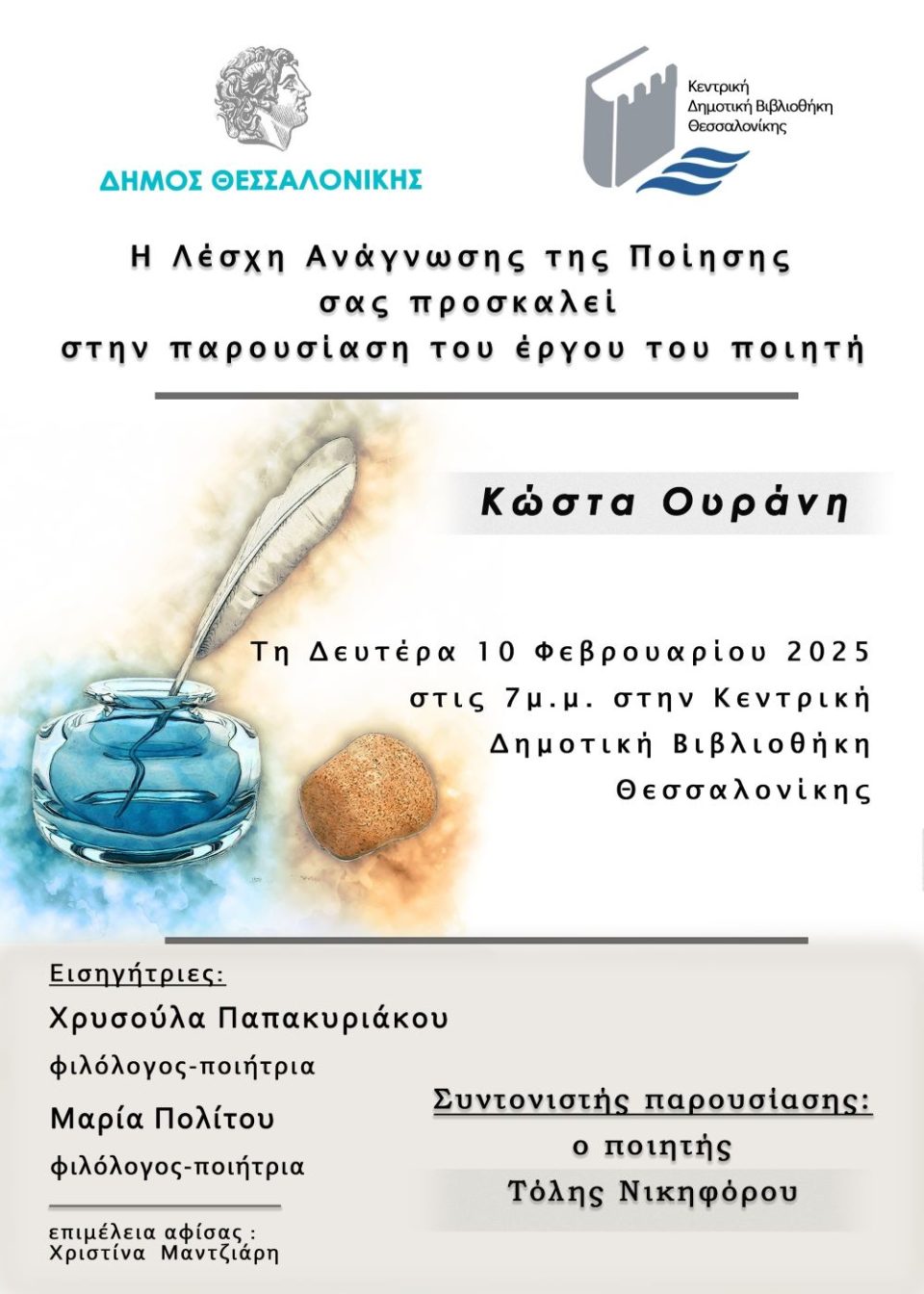 Η Κεντρική Δημοτική Βιβλιοθήκη Θεσσαλονίκης και η Λέσχη Ανάγνωσης της Ποίησης σας προσκαλούν τη Δευτέρα 10 Φεβρουαρίου στις 19.00, στην παρουσίαση του έργου του ποιητή Κώστα Ουράνη στην αίθουσα εκδηλώσεων της Βιβλιοθήκης (Εθνικής Αμύνης 27 & Αλεξ. Σβώλου).