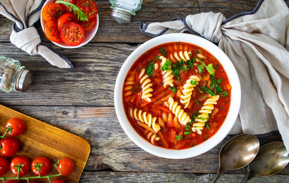 - Προσθέστε τις ντομάτες, τα ρεβίθια και τα ζυμαρικά. Θρυμματίζετε τον κύβο, προσθέστε την παρμεζάνας και ρίξτε 1 λίτρο νερό.