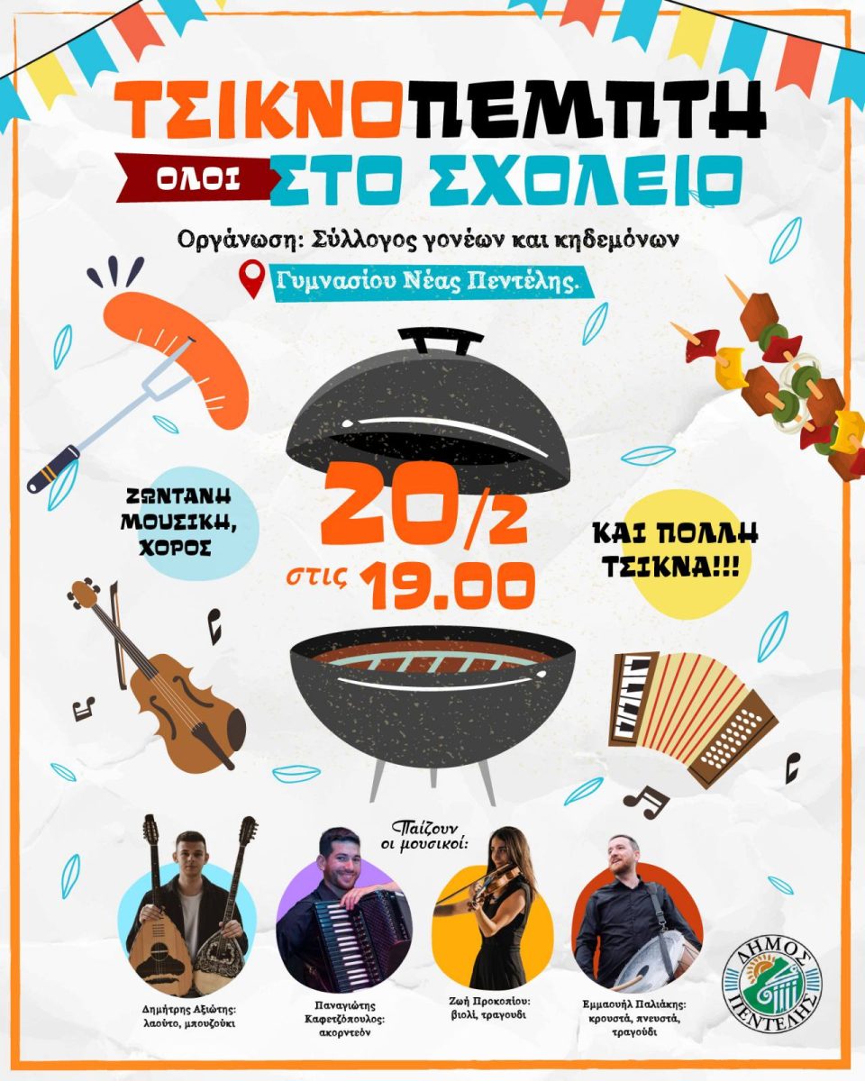 Φορώντας αποκριάτικες στολές μα πάνω από όλα την καλύτερη διάθεσή μας, ο Δήμος Πεντέλης με πρωτοβουλία του Συλλόγου Γονέων και Κηδεμόνων του Γυμνασίου Νέας Πεντέλης μας καλεί όλους μικρούς και μεγάλους σε ένα νεανικό παραδοσιακό γλέντι γεμάτο μουσική, χορό και κέφι με τους Δημήτρη Αξιώτη, Παναγιώτη Καφετζόπουλο, Ζωή Προκοπίου και Εμμανουήλ Παλιάκη!