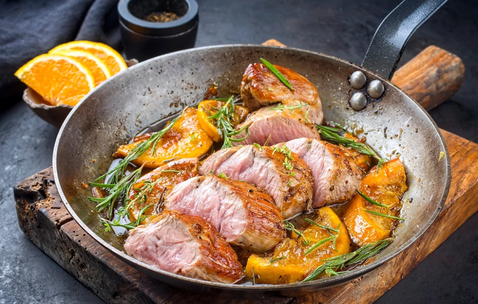 - Ζεστάνετε το λάδι σε ένα μεγάλο τηγάνι, κατά προτίμηση αντικολλητικό, προσθέτετε το χοιρινό κρέας και τηγανίστε γρήγορα μέχρι να ροδίσει παντού. Μαγειρέψτε το χοιρινό για περίπου 5 λεπτά, στη συνέχεια αφαιρέστε το σε ένα πιάτο και σκεπάστε το με αλουμινόχαρτο όσο φτιάχνετε τη σάλτσα.