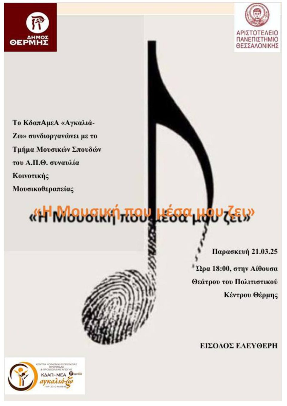 Το ΚΔΑΠ μεΑ “Αγκαλιά-ζω” του Δήμου Θέρμης, σε συνδιοργάνωση με το Τμήμα Μουσικών Σπουδών του Αριστοτελείου Πανεπιστημίου Θεσσαλονίκης, διοργανώνουν συναυλία Κοινοτικής Μουσικοθεραπείας, με θέμα: “Η μουσική που μέσα μου ζει”.