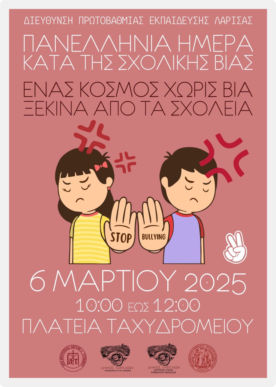 Η Διεύθυνση Πρωτοβάθμιας Εκπαίδευσης Λάρισας και η Ομάδα Δράσης της για την Πρόληψη και Αντιμετώπιση της Ενδοσχολικής Βίας και του Εκφοβισμού (Ε.ΒΙ.Ε), διοργανώνουν εκδήλωση με τίτλο: «Ένας κόσμος χωρίς βία ξεκινά από τα σχολεία», η οποία θα πραγματοποιηθεί στην Πλατεία Ταχυδρομείου (Εθνάρχου Μακαρίου), την Πέμπτη 6/3/2025 και ώρα 10.00 π.μ. έως 12.00 μ.
