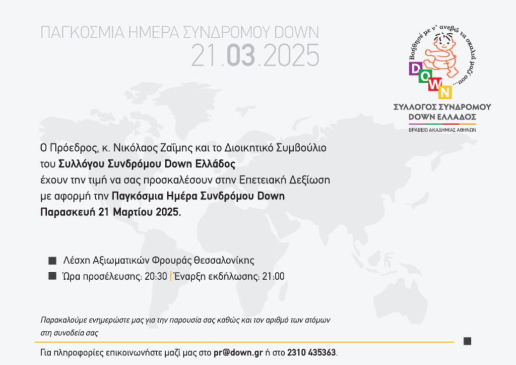 News ΑΜΕΑΚεντρικήΕπετειακή Δεξίωση για την Παγκόσμια Ημέρα Συνδρόμου Down by xristiana19 Μαρτίου 202519 Μαρτίου 20250133 Share00 19/3/2025