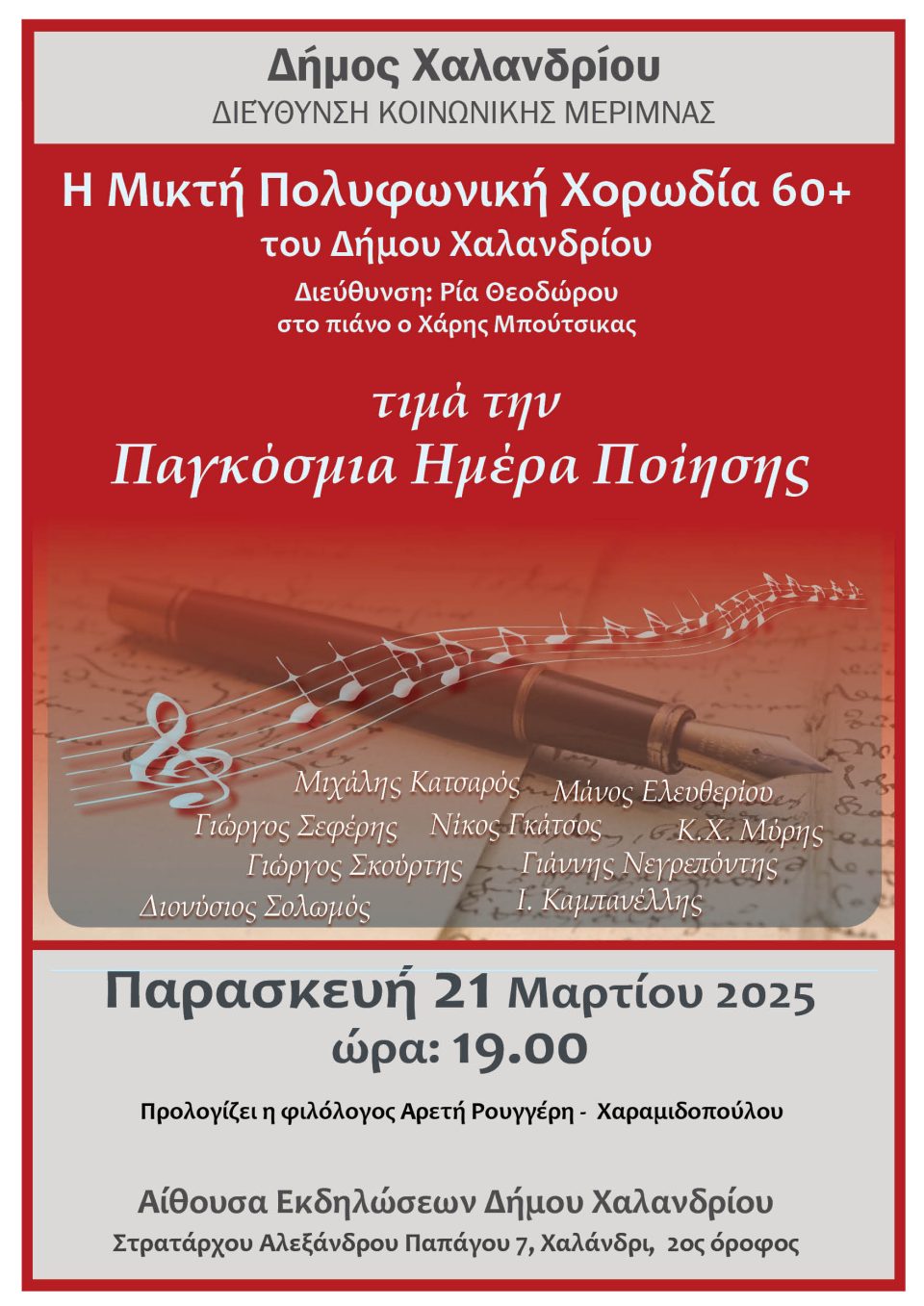 Την Παρασκευή 21 Μαρτίου 2025 και ώρα 19.00 , η μικτή πολυφωνική χορωδία 60+ του Δήμου Χαλανδρίου, υπο τη διεύθυνση της Ρίας Θεοδώρου τιμούν την Παγκόσμια Ημέρα Ποίησης. Ένα όμορφο ταξίδι στη μελοποιημένη ποίηση!