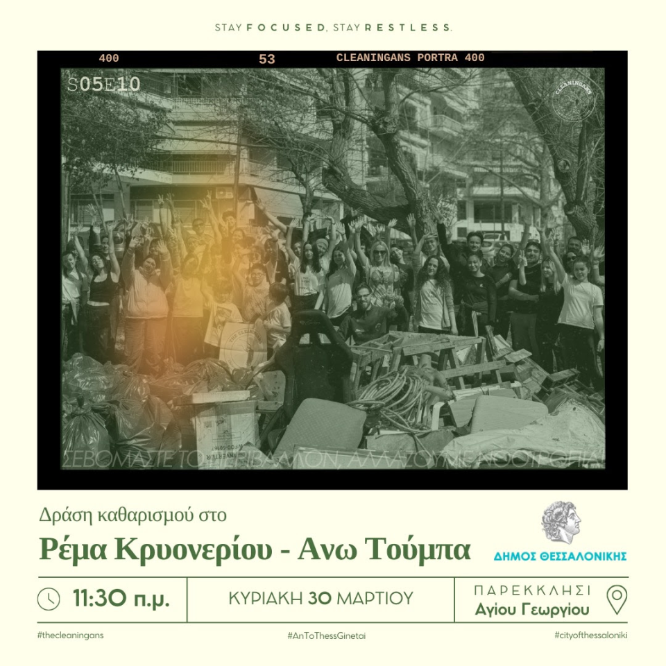 Δράση καθαρισμού για μια πιο καθαρή Θεσσαλονίκη οργανώνει το πρωί της Κυριακής 30 Μαρτίου ο Δήμος Θεσσαλονίκης σε συνεργασία με τους Cleaningans στην περιοχή της Τούμπας. Με ανακοίνωση του ο Δήμος απευθύνει κάλεσμα σε εθελοντές που θέλουν να συμμετέχουν στον καθαρισμό του το Πάρκου/Ρέματος Κρυονερίου.