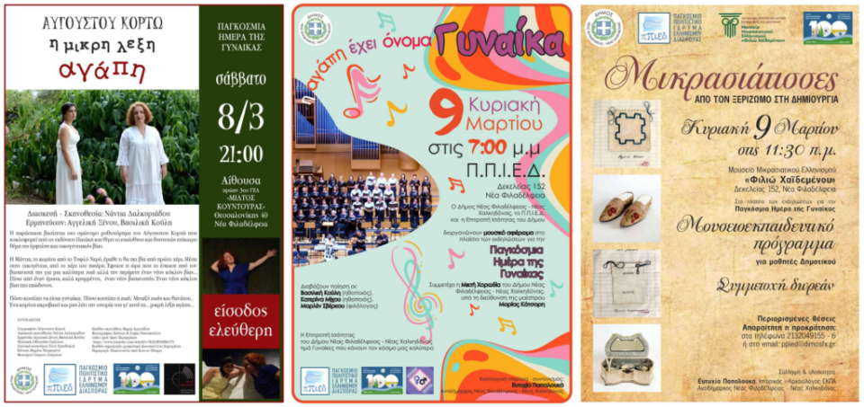 Ο Δήμος Νέας Φιλαδέλφειας – Νέας Χαλκηδόνας, το Παγκόσμιο Πολιτιστικό Ίδρυμα Ελληνισμού της Διασποράς – Μουσείο Μικρασιατικού Ελληνισμού «Φιλιώ Χαϊδεμένου» και η Επιτροπή Ισότητας του Δήμου, τιμώντας την Παγκόσμια Ημέρα της Γυναίκας, διοργανώνουν διήμερο εκδηλώσεων το Σάββατο 8 και την Κυριακή 9 Μαρτίου 2025.