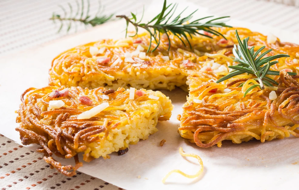 - Σε μέτρια φωτιά, ζεστάνετε το βούτυρο σε ένα τηγάνι. Προσθέστε το μείγμα με τα σπαγγέτι, απλώνοντας τα ζυμαρικά ομοιόμορφα σε όλο το τηγάνι.