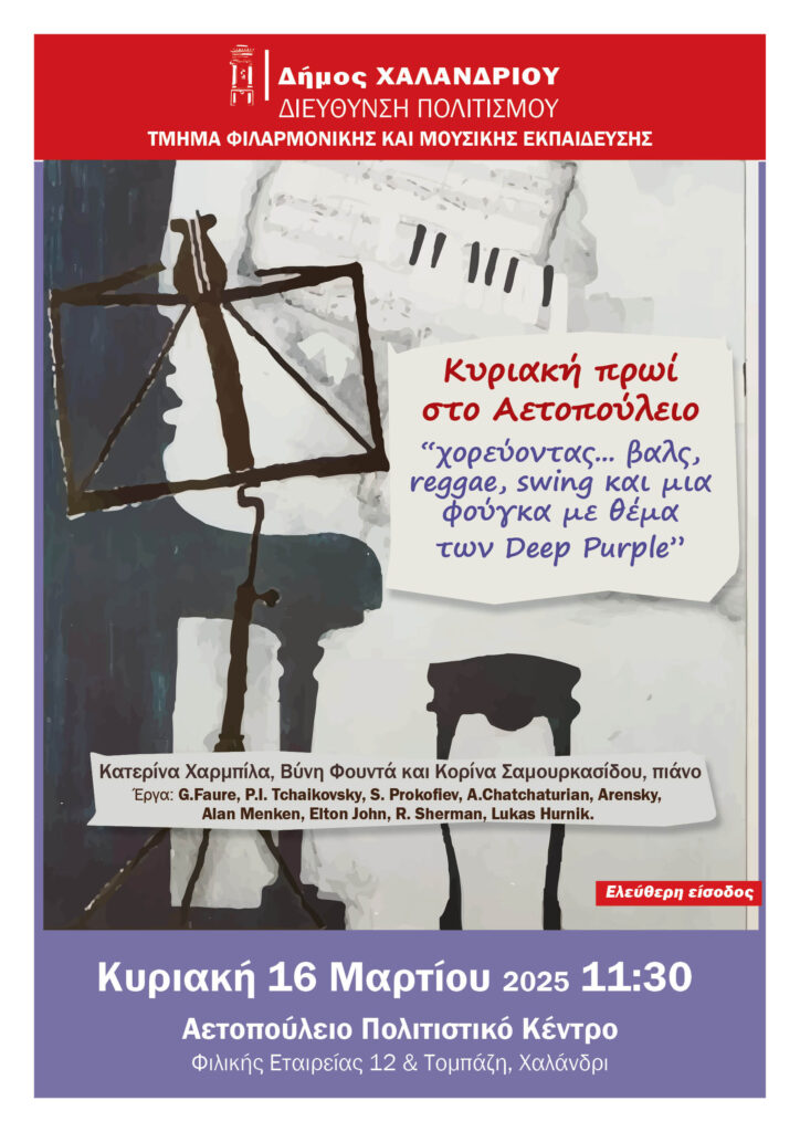 Την Κυριακή 16 Μαρτίου στις 11:30 θα πραγματοποιηθεί στο Αετοπούλειο Πολιτιστικό Κέντρο του Δήμου Χαλανδρίου (Φιλικής Εταιρείας 12 & Τομπάζη) η δεύτερη συναυλία του μουσικού κύκλου Κυριακή πρωί στο Αετοπούλειο, που φιλοδοξεί να φέρει την κλασική μουσική πιο κοντά σε μη εκπαιδευμένο κοινό.