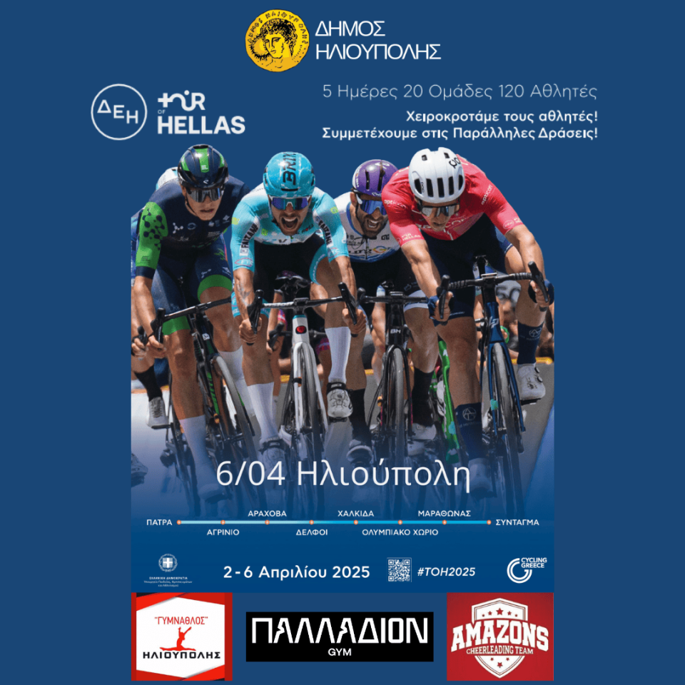 Η Ηλιούπολη υποδέχεται το ΔΕΗ Tour of Hellas 2025 την Κυριακή 6 Απριλίου 2025, με μια μοναδική παράλληλη δράση στην Πλατεία Φλέμινγκ από 11:45 έως 14:20. Σας προσκαλούμε να απολαύσετε εντυπωσιακές αθλητικές επιδείξεις και να ενισχύσετε τους αθλητές στο καθοριστικό Sprint που θα αναδείξει τον νικητή του αγώνα!