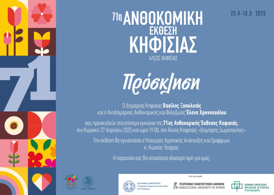 Ο Δήμαρχος Κηφισιάς Βασίλης Ξυπολυτάς και η Αντιδήμαρχος Ανθοκομικής και Φιλοζωίας Έλενα Χρονόπουλου σας προσκαλούν στα επίσημα εγκαίνια της 71ης Ανθοκομικής Έκθεσης Κηφισιάς, την Κυριακή 27 Απριλίου 2025 και ώρα 19:00, στο Άλσος Κηφισιάς «Δημήτρης Ζωμόπουλος».
