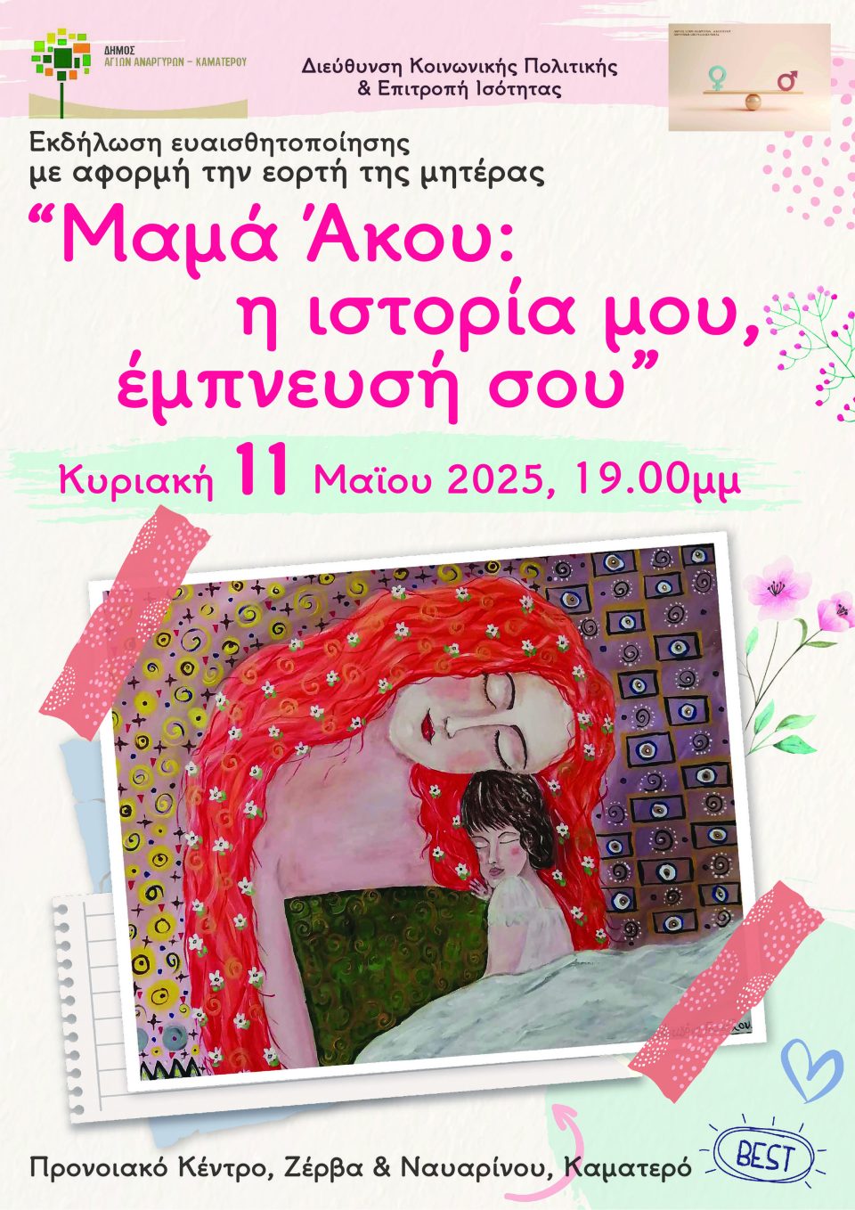 ΚεντρικήΚοινωνικάΕκδήλωση για τη γιορτή της Μητέρας by xristiana27 Απριλίου 202527 Απριλίου 20250215 Share00 27/4/2025 Ενημερώνουμε τους δημότες μας ότι την Κυριακή 11 Μαΐου και ώρα 19.00 στο Προνοιακό Κέντρο στο Καματερό θα πραγματοποιηθεί εκδήλωση ευαισθητοποίησης για τη γιορτή της μητέρας με τον τίτλο: «Μαμά άκου, η ιστορία μου, έμπνευσή σου».