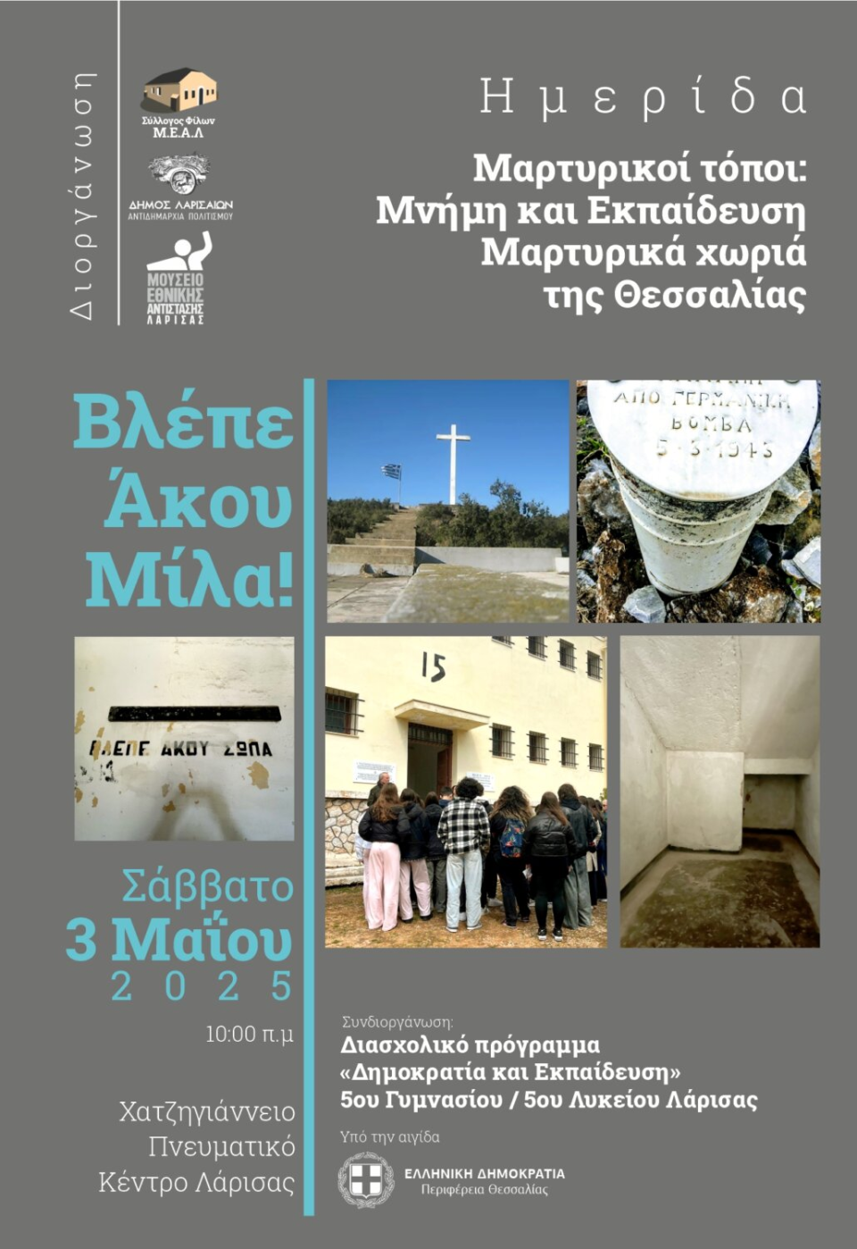 O Σύλλογος Φίλων Μουσείου Εθνικής Αντίστασης Λάρισας, η Αντιδημαρχία Πολιτισμού του Δήμου Λαρισαίων, το Μουσείο Εθνικής Αντίστασης Λάρισας σε συνεργασία με το διασχολικό πρόγραμμα «Δημοκρατία και Εκπαίδευση» των 5ου Γυμνασίου και 5ου Λυκείου Λάρισας, συνδιοργανώνουν ημερίδα με θέμα: «Μαρτυρικοί τόποι: Μνήμη και Εκπαίδευση / Μαρτυρικά χωριά της Θεσσαλίας».