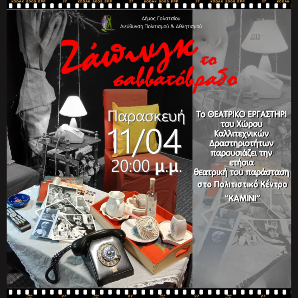 Το Θεατρικό Εργαστήρι του Χώρου Καλλιτεχνικών Δραστηριοτήτων και Εκπαίδευσης Δήμου Γαλατσίου στο ΠΑΛΑΙ , με υπεύθυνη τη θεατρολόγο Δέσποινα Τσελίκα, παρουσιάζει την Παρασκευή 11 Απριλίου 2025,στις 20:00, την παράσταση «Ζάπινγκ το Σαββατόβραδο», στο Πολιτιστικό Κέντρο Δήμου Γαλατσίου “Το Καμίνι”.