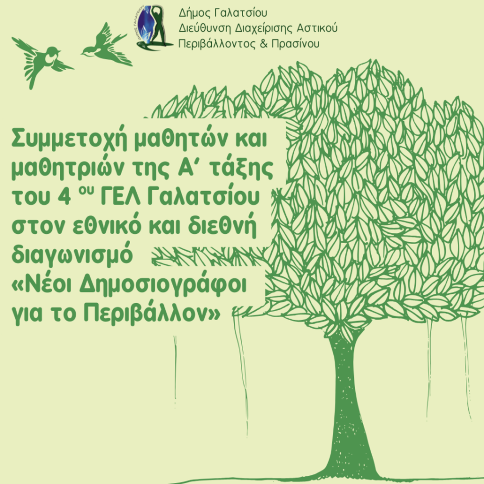 Στο πλαίσιο του μαθήματος των αγγλικών, μέσα από τις εργασίες τους και με την υποστήριξη της καθηγήτριάς τους, κ. Α. Αγγελοπούλου, οι μαθητές και οι μαθήτριες συμμετέχουν και φέτος στον Εθνικό και Διεθνή Διαγωνισμό, που διοργανώνεται από το Διεθνές Δίκτυο ΠΕ «Νέοι Δημοσιογράφοι για το Περιβάλλον», του οποίου Εθνικός Συντονιστής στην Ελλάδα είναι η Ελληνική Εταιρία Προστασίας της Φύσης, με σκοπό την ανάδειξη του καλύτερου άρθρου, φωτογραφίας, βίντεο ή/και podcast με περιβαλλοντικό περιεχόμενο.
