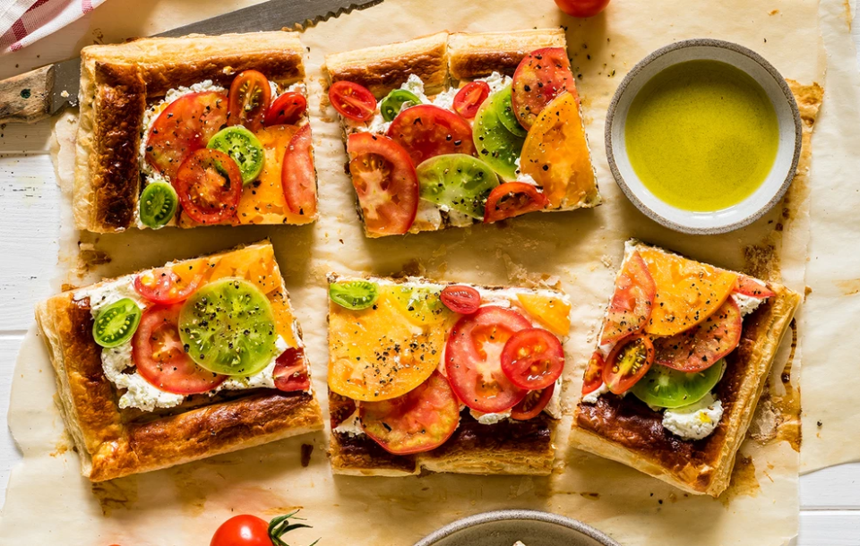 - Βγάλτε τη βάση της τάρτας από το φούρνο και αυξήστε τη θερμοκρασία στους 200 βαθμούς. Τοποθετήστε τα ψημένα λαχανικά στη βάση από σφολιάτα, σκορπίστε τα ντοματίνια και το κατσικίσιο τυρί και αλατοπιπερώστε.