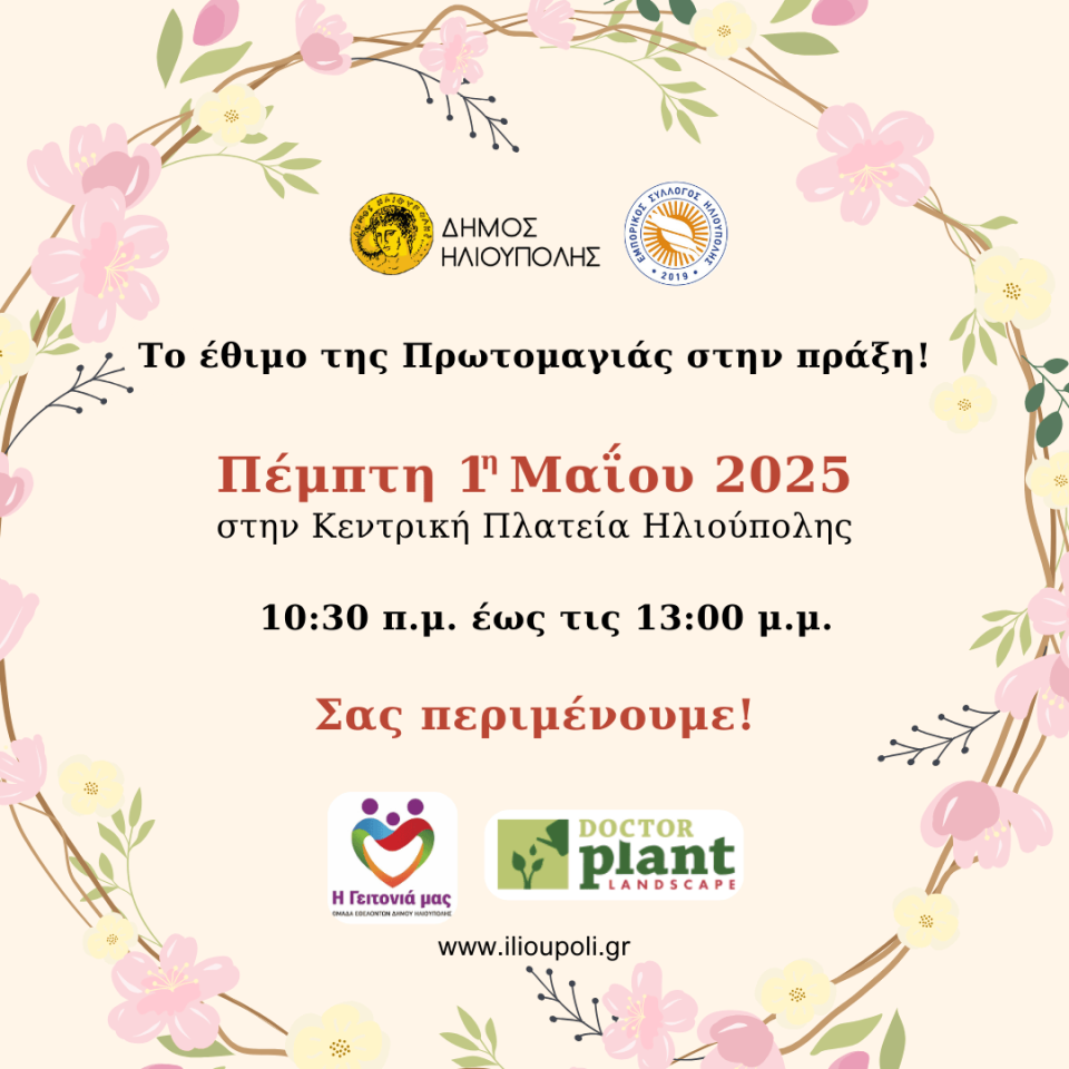 Ο Δήμος Ηλιούπολης και ο Εμπορικός Σύλλογος Ηλιούπολης σε συνεργασία με την Εθελοντική Ομάδα «Η Γειτονιά μας» σάς προσκαλούν την Πρωτομαγιά στην Κεντρική Πλατεία Ηλιούπολης (Πλατεία Εθνικής Αντίστασης) από τις 10:30 π.μ. έως τις 13:00 μ.μ. για να τιμήσουμε μαζί το έθιμο της Πρωτομαγιάς, δημιουργώντας φιλότεχνα χειροποίητα στεφανάκια.