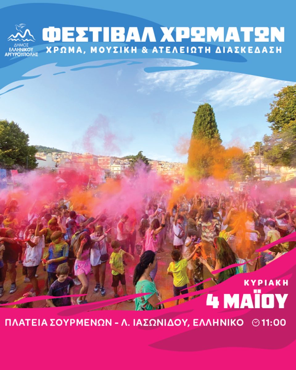 Η Πλατεία Σουρμένων μεταμορφώνεται σε ένα πολύχρωμο σκηνικό γεμάτο ζωή, ρυθμό και ενέργεια. Πρόκειται για μια διαδραστική γιορτή γεμάτη δημιουργικά εργαστήρια και δραστηριότητες για παιδιά και οικογένειες, παιχνίδια, happenings και εκπλήξεις, με τοίχο αναρρίχησης, τοξοβολία, εργαστήρια χειροτεχνίας, εργαστήρια ανακύκλωσης, facepainting και 3d κάστρο ζωγραφικής, εμπνευσμένα από την παράδοση των φεστιβάλ χρωμάτων που τιμώνται σε ολόκληρο τον κόσμο, με στόχο να ενώσουν ανθρώπους κάθε ηλικίας μέσα από τη χαρά, τη μουσική, το παιχνίδι και την τέχνη.