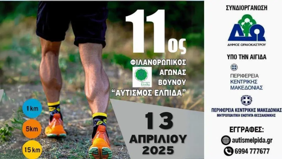 Ο Σύλλογος Φίλων Αυτιστικού Ατόμου της Μονάδας «ΕΛΠΙΔΑ», σε συνδιοργάνωση με τον δήμο Ωραιοκάστρου, υπό την αιγίδα της Περιφέρειας Κεντρικής Μακεδονίας και με την τεχνική υποστήριξη του ΣΔΥ Θεσσαλονίκης, ανακοινώνει τη διεξαγωγή του 11ου Φιλανθρωπικού Αγώνα Βουνού «Αυτισμός – ΕΛΠΙΔΑ», την Κυριακή 13 Απριλίου 2025.