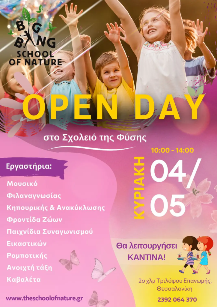 Το Σχολείο της Φύσης ανοίγει τις πόρτες του για μικρούς και μεγάλους, σε μια γιορτινή Open Day γεμάτη παιχνίδι, δημιουργία και επαφή με τη φύση! Την Κυριακή 4 Μαΐου, από τις 10:00 έως τις 14:00, σε έναν καταπράσινο χώρο λίγο έξω από τη Θεσσαλονίκη!