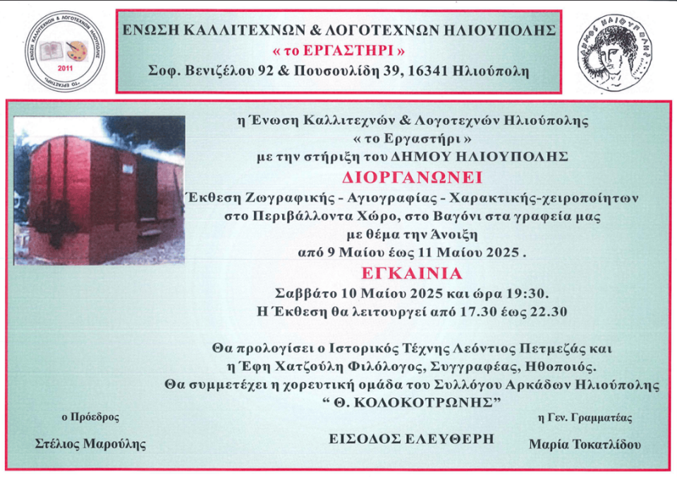 Η Ένωση Καλλιτεχνών & Λογοτεχνών Ηλιούπολης «Το Εργαστήρι» διοργανώνει με την υποστήριξη του Δήμου Ηλιούπολης, Έκθεση Ζωγραφικής – Αγιογραφίας – Χαρακτικής – Χειροποίητων με θέμα την Άνοιξη, από 9 Μαΐου έως 11 Μαΐου 2025, από τις 17.30 μ.μ. έως τις 22.30 μ.μ. στον περιβάλλοντα χώρο, στο Βαγόνι (Γραφεία Ένωσης, Σοφοκλή Βενιζέλου 92 & Πουσουλίδη 39).