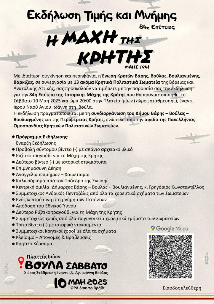 Με ιδιαίτερη συγκίνηση και περηφάνια, η Ένωση Κρητών Βάρης, Βούλας, Βουλιαγμένης, Βάρκιζας, σε συνεργασία με 13 ακόμα Κρητικά Πολιτιστικά Σωματεία της Βόρειας και Ανατολικής Αττικής, σας προσκαλούν να τιμήσετε με την παρουσία σας την εκδήλωση για την 84η Επέτειο της Ιστορικής Μάχης της Κρήτης που θα πραγματοποιηθεί το Σάββατο 10 Μάη 2025 και ώρα 20:00 στην Πλατεία Ιμίων (χώρος στάθμευσης), έναντι Ιερού Ναού Αγίου Ιωάννη στη Βούλα.