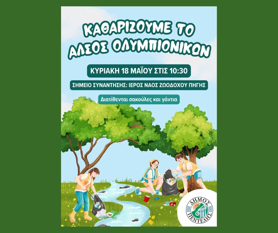 Την Κυριακή 18 Μαΐου στις 10:30 σας περιμένουμε όλους στον Ιερό Ναό Ζωοδόχου Πηγής για να συμβάλουμε μαζί σε μια πιο καθαρή και όμορφη Πεντέλη!