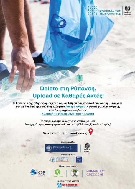 Ο Δήμος Αλίμου και η Κοινωνία της Πληροφορίας σάς προσκαλούν στον Εθελοντικό Καθαρισμό της Παραλίας που θα πραγματοποιήσουν στις 18 Μαΐου 2025 και σας δίνουν ραντεβού στις 11 το πρωί στα Λουτρά Αλίμου.