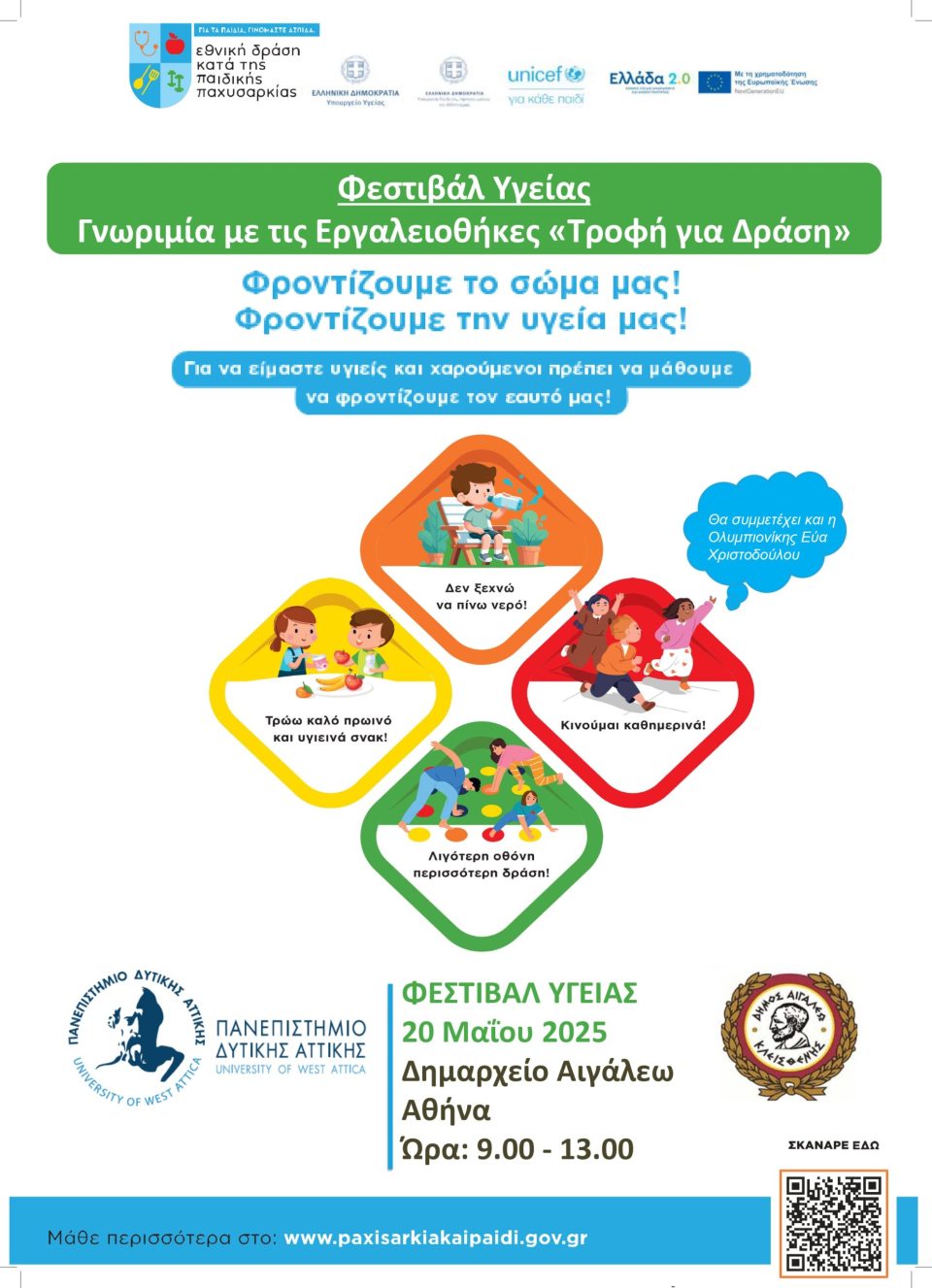 Ο Δήμος Αιγάλεω, σε συνεργασία με την Ερευνητική Ομάδα του Πανεπιστημίου Δυτικής Αττικής (ΠΑΔΑ), διοργανώνει Φεστιβάλ Υγείας με τίτλο «Γνωριμία με τις Εργαλειοθήκες – Τροφή για Δράση», τη Τρίτη 20 Μαΐου 2025 και ώρα 09:30, στο Δημαρχείο Αιγάλεω.