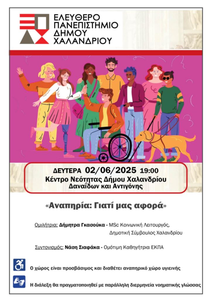 Τη Δευτέρα 02/06 και ώρα 19:00 στο Κέντρο Νεότητας (Δαναΐδων & Αντιγόνης) το Ελεύθερο Πανεπιστήμιο του Δήμου Χαλανδρίου φιλοξενεί την τελευταία του εκδήλωση για την τρέχουσα περίοδο με θέμα: «Αναπηρία: Γιατί μας αφορά ;»
