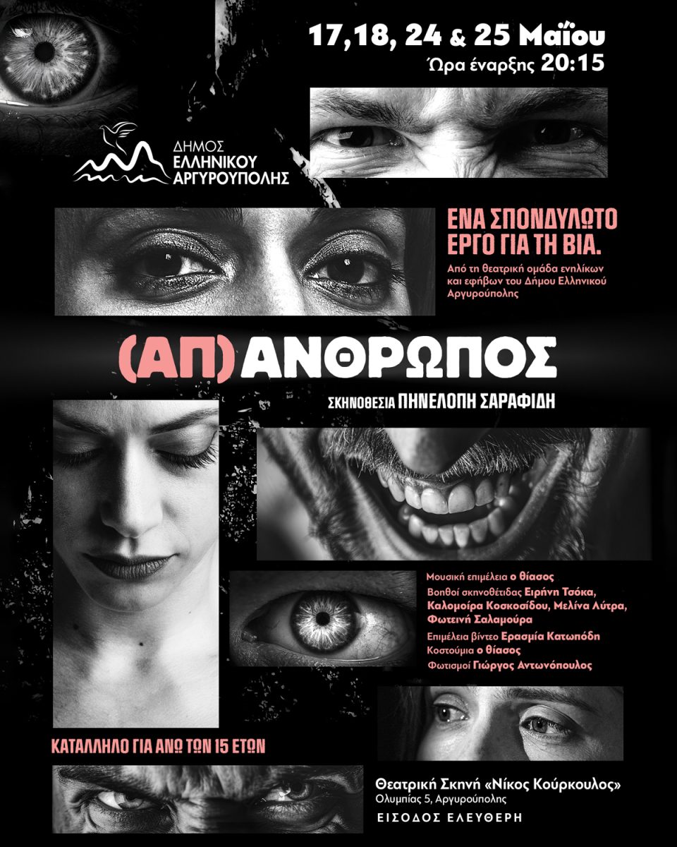 Στις 17, 18, 24 και 25 Μαΐου στις 20:15 στην Θεατρική Σκηνή «Νίκος Κούρκουλος» (Ολυμπίας 5, Αργυρούπολη), η θεατρική ομάδα ενηλίκων και εφήβων του Δήμου Ελληνικού-Αργυρούπολης παρουσιάζει στο κοινό το συγκλονιστικό έργο «(ΑΠ)ΑΝΘΡΩΠΟΣ», σε σκηνοθεσία Πηνελόπης Σαραφίδη.
