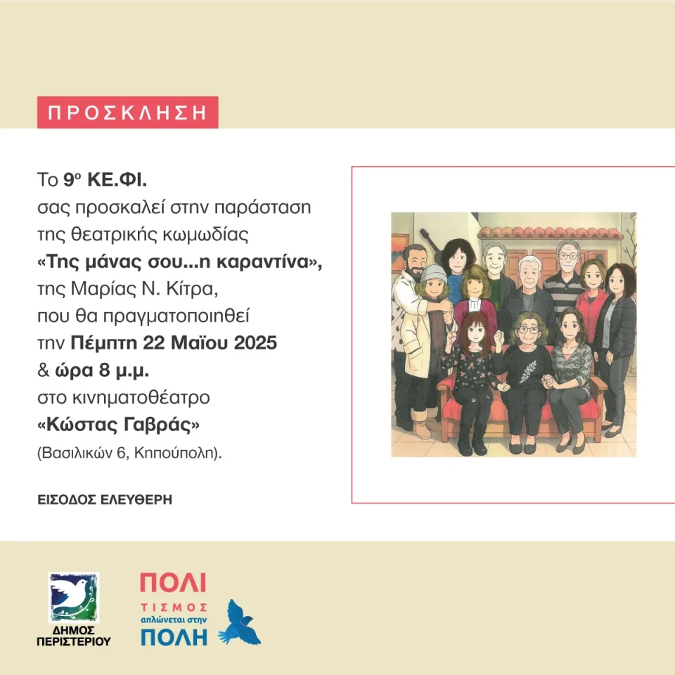 Μια ξεκαρδιστική θεατρική κωμωδία παρουσιάζει το 9ο Κέντρο Φιλίας (ΚΕ.ΦΙ.) του Δήμου Περιστερίου, την Πέμπτη 22 Μαΐου 2025 και ώρα 20:00, στο κινηματοθέατρο «Κώστας Γαβράς» (Βασιλικών 6, Κηπούπολη). Η είσοδος είναι ελεύθερη, με σειρά προσέλευσης.