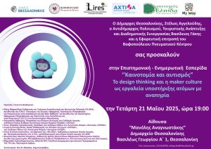 Επιστημονική και ενημερωτική εσπερίδα με θέμα «Καινοτομία και Αυτισμός» διοργανώνει, την Τετάρτη 21 Μαΐου 2025, το Βαφοπούλειο Πνευματικό Κέντρο σε συνεργασία με το Εργαστήριο Εφαρμογών Πληροφορικής και Ρομποτικής στην Εκπαίδευση και στην Κοινωνία (L.I.R.E.S.) του Πανεπιστημίου Μακεδονίας, τον Σύλλογο Αρωγής Συλλόγου Γονέων & Φίλων Αυτιστικών Ατόμων Βορείου Ελλάδος «ΑΧΤΙΔΑ», το Κέντρο Αυτισμού «ΕΛΠΙΔΑ» του Συλλόγου Φίλων του Αυτιστικού Ατόμου «Αυτισμός-ΕΛΠΙΔΑ» και το Κέντρο Εκμάθησης ξένων γλωσσών σε μαθητές με δυσλεξία και άλλες ειδικές μαθησιακές διαφορετικότητες «Μy Way».