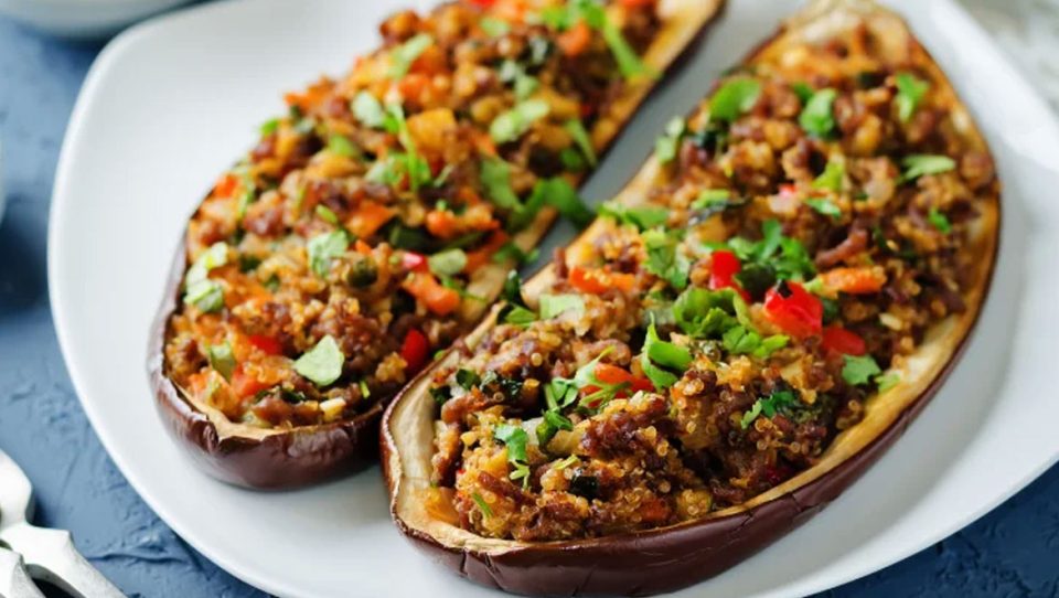 Γεμίζεις κάθε μελιτζάνα με το μείγμα από την κατσαρόλα, ρίχνεις από πάνω φρυγανιά και ελαιόλαδο και τις τοποθετείς προσεχτικά στο ταψί