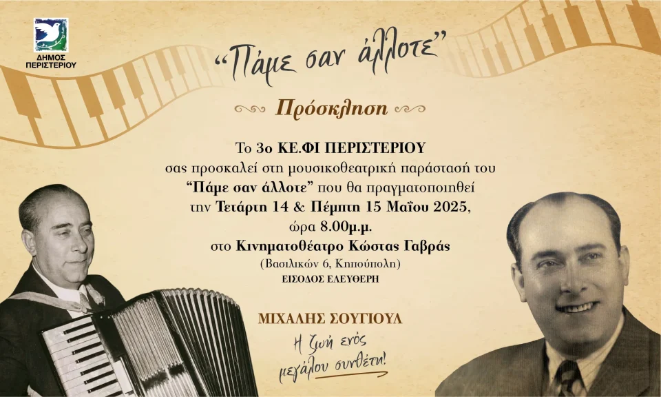 Ο Δήμαρχος Περιστερίου Ανδρέας Π. Παχατουρίδης προσκαλεί το κοινό σε μια ξεχωριστή μουσικοθεατρική παράσταση αφιερωμένη στον μεγάλο Έλληνα συνθέτη Μιχάλη Σουγιούλ, με τίτλο «Πάμε σαν άλλοτε – Η ζωή ενός μεγάλου συνθέτη!».Την παράσταση ανεβάζει το 3ο Κέντρο Φιλίας (ΚΕ.ΦΙ.) Δήμου Περιστερίου, με τη συμμετοχή μελών του, αναδεικνύοντας με συγκίνηση και μεράκι την πορεία και το έργο του κορυφαίου δημιουργού, μέσα από τραγούδια, θεατρικά δρώμενα και προβολές.Η εκδήλωση θα πραγματοποιηθεί την Τετάρτη 14 και Πέμπτη 15 Μαΐου 2025, στις 8:00 το βράδυ, στο Κινηματοθέατρο Κώστας Γαβράς (Βασιλικών 6, Κηπούπολη). Η είσοδος είναι ελεύθερη για το κοινό.Με φόντο τις αξέχαστες μελωδίες του Σουγιούλ, η παράσταση υπόσχεται ένα ταξίδι στο παρελθόν, γεμάτο μνήμες, συγκίνηση και πολιτισμό.