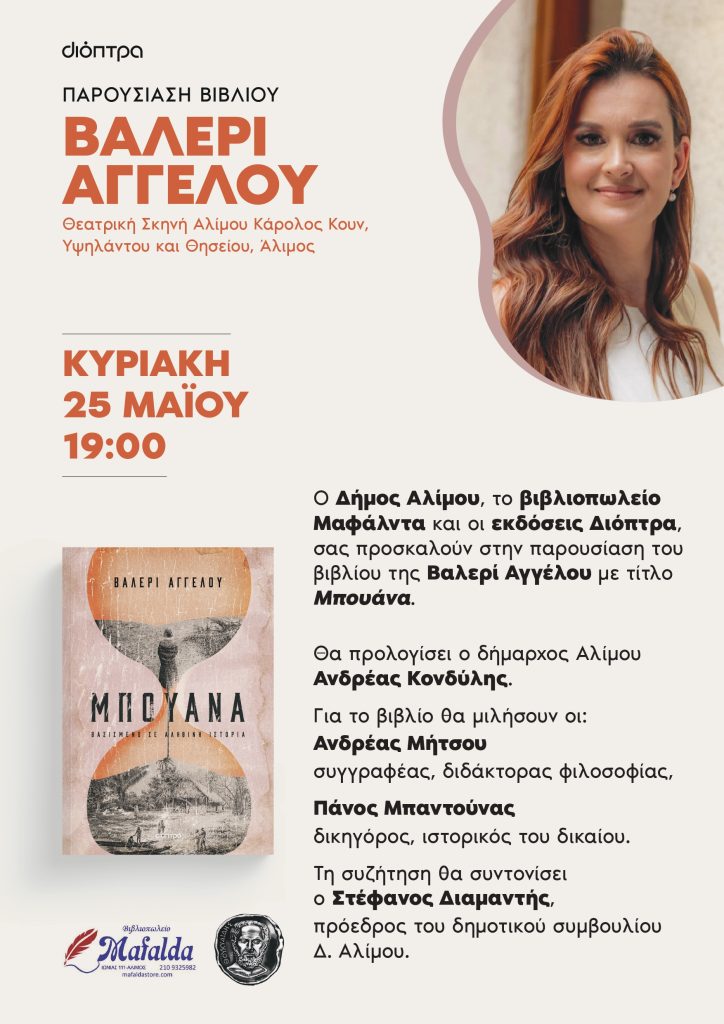 Ο Δήμος Αλίμου, το βιβλιοπωλείο Μαφάλντα και οι εκδόσεις Διόπτρα, σας προσκαλούν την Κυριακή 25 Μαΐου, στις 7 μ.μ., στη θεατρική σκηνή «Κάρολος Κουν» (Υψηλάντου και Θησείου) για την παρουσίαση του βιβλίου τής Βαλερί Αγγέλου με τίτλο «Μπουάνα».
