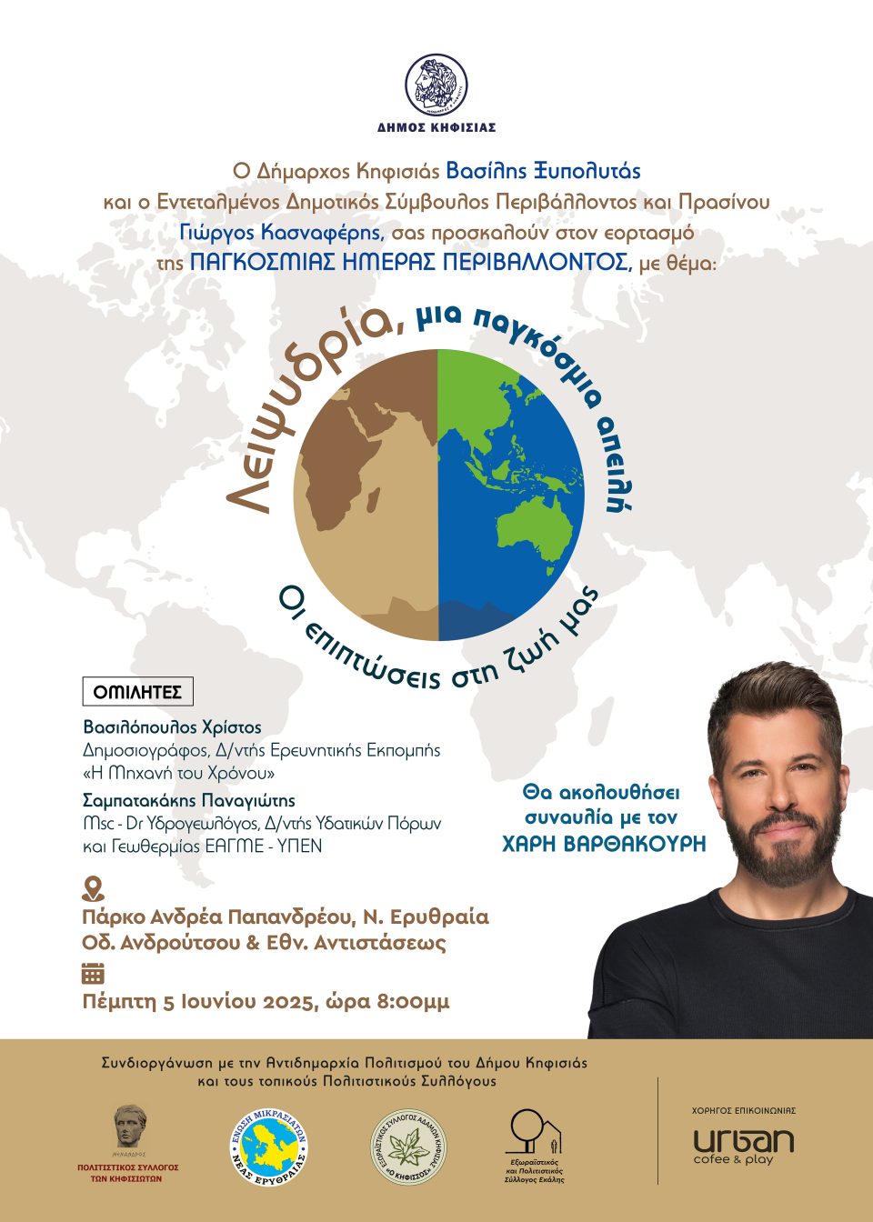 Ο Δήμαρχος Κηφισιάς Βασίλης Ξυπολυτάς και ο Εντεταλμένος Δημοτικός Σύμβουλος Περιβάλλοντος και Πρασίνου Γιώργος Κασναφέρης σας προσκαλούν στον εορτασμό της ΠΑΓΚΟΣΜΙΑΣ ΗΜΕΡΑΣ ΠΕΡΙΒΑΛΛΟΝΤΟΣ, με θέμα: «Λειψυδρία μια παγκόσμια απειλή – Oι επιπτώσεις στη ζωή μας» που θα πραγματοποιηθεί την Πέμπτη 5 Ιουνίου 2025 και ώρα 8:00μμ, στο Πάρκο Ανδρέα Παπανδρέου (Οδ. Ανδρούτσου & Εθνικής Αντιστάσεως) στη Νέα Ερυθραία.