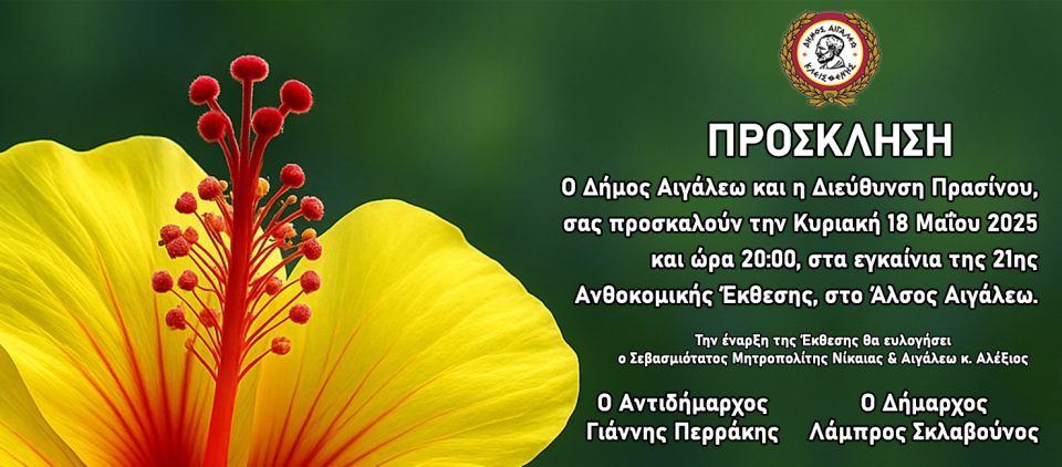 Ο Δήμος Αιγάλεω και η Διεύθυνση Πρασίνου, σας προσκαλούν, την Κυριακή 18 Μαΐου 2025 και ώρα 20:00, στα εγκαίνια της 21ης Ανθοκομικής Έκθεσης, στο Άλσος Αιγάλεω.