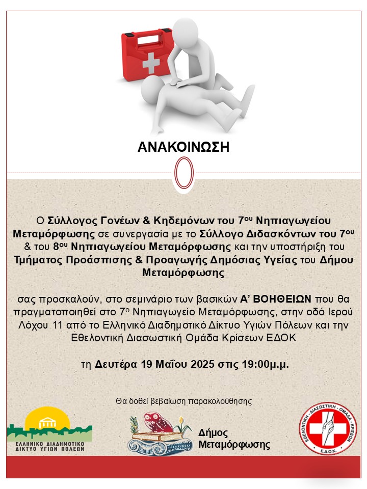 στο σεμινάριο των βασικών Α’ ΒΟΗΘΕΙΩΝ που θα πραγματοποιηθεί τη Δευτέρα 19 Μαΐου 2025 στις 19:00μ.μ., στο 7ο Νηπιαγωγείο Μεταμόρφωσης στην οδό Ιερού Λόχου 11 από το Ελληνικό Διαδημοτικό Δίκτυο Υγιών Πόλεων και την Εθελοντική Διασωστική Ομάδα Κρίσεων ΕΔΟΚ.