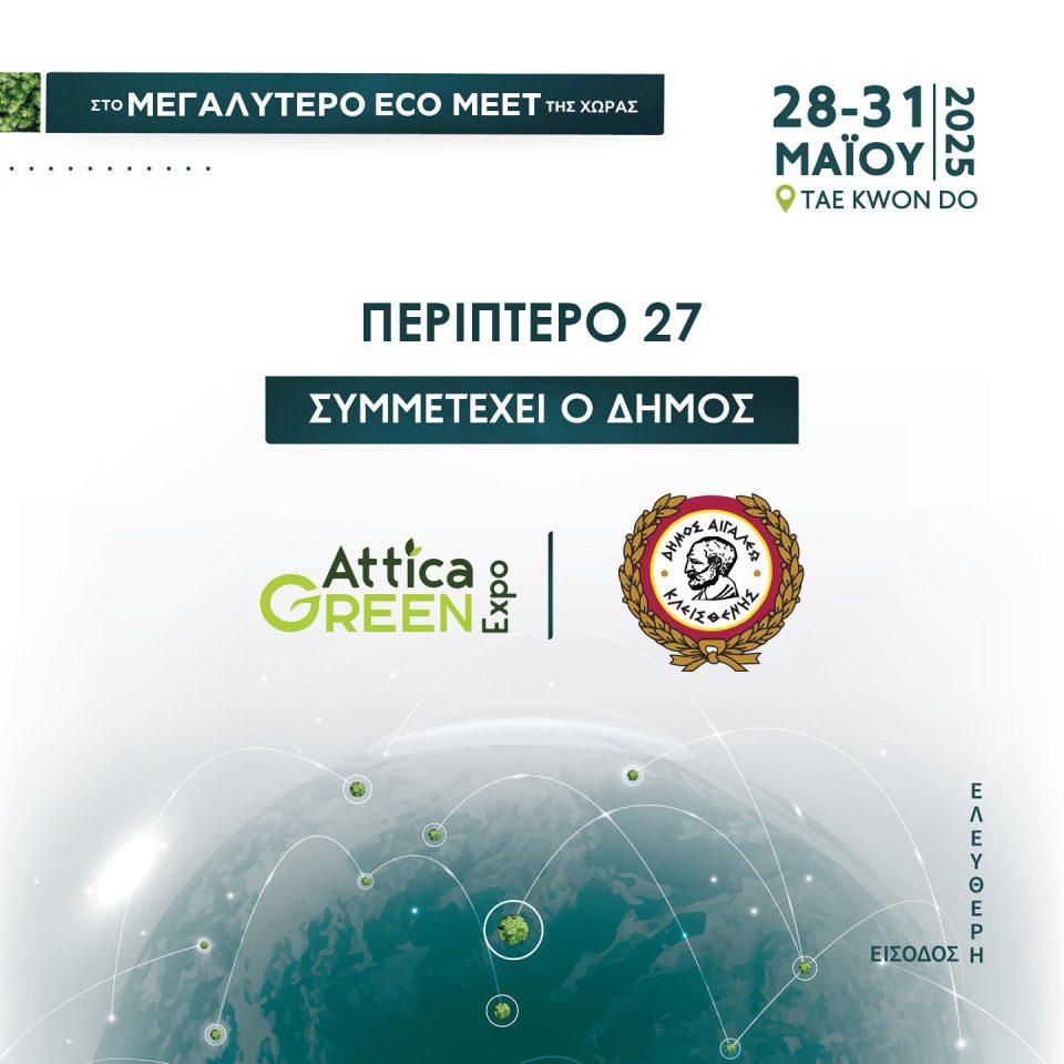 Με δικό του περίπτερο θα συμμετέχει ο Δήμος Αιγάλεω στην Περιβαλλοντική Έκθεση Αttica Green Expo 2025, που θα φιλοξενηθεί στον χώρο των Ολυμπιακών Εγκαταστάσεων TAE KWON DO Παλαιού Φαλήρου, από τις 28 έως τις 31 Μαΐου, με ελεύθερη είσοδο για όλους, δωρεάν parking, εκπλήξεις και πολλά δώρα!
