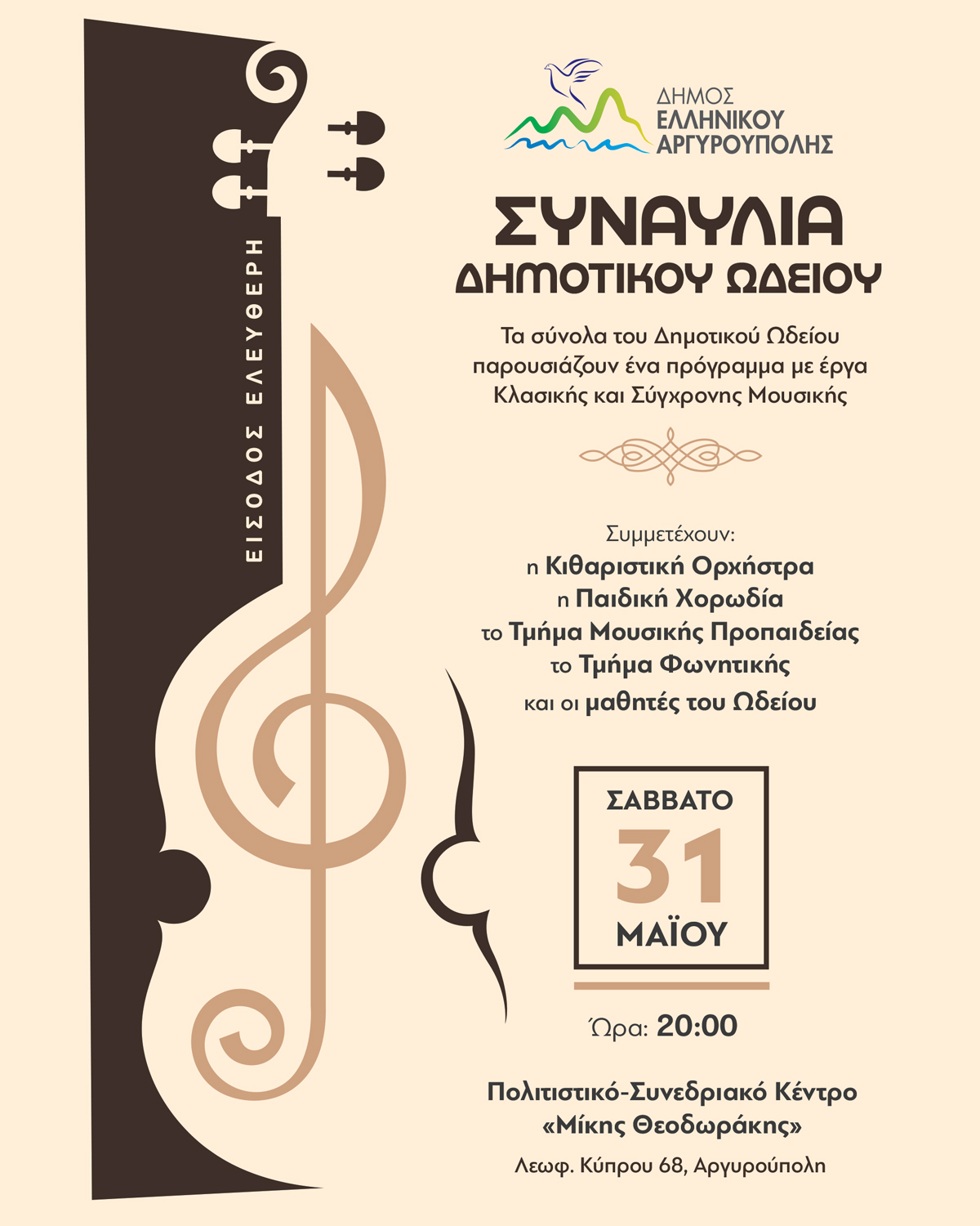 Το Δημοτικό Ωδείο του Δήμου Ελληνικού – Αργυρούπολης σας προσκαλεί σε μια συναυλία γεμάτη έμπνευση και νεανική δημιουργικότητα, το Σάββατο 31 Μαΐου και ώρα 20:00 στο Πολιτιστικό – Συνεδριακό Κέντρο «Μίκης Θεοδωράκης» (Λεωφ. Κύπρου 68, Αργυρούπολη).